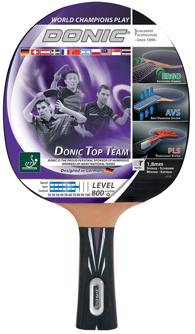 Der „Top Team 800“ der deutschen Premiummarke Donic ist ein sehr hochwertiger, extrem gut ausgestatteter Schläger für den ambitionierten Freizeitsport und das sehr regelmäßige Hobby-Spiel für anspruchsvolle Spieler, die mit Allround-Spielweise agieren.