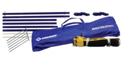 - Komplette, hochwertige Freizeit Beachvolleyball-Netzgarnitur bestehend aus 3-teiligen robusten Stahlpfosten (Durchmesser Pfosten 3,2cm, blau lackiert)