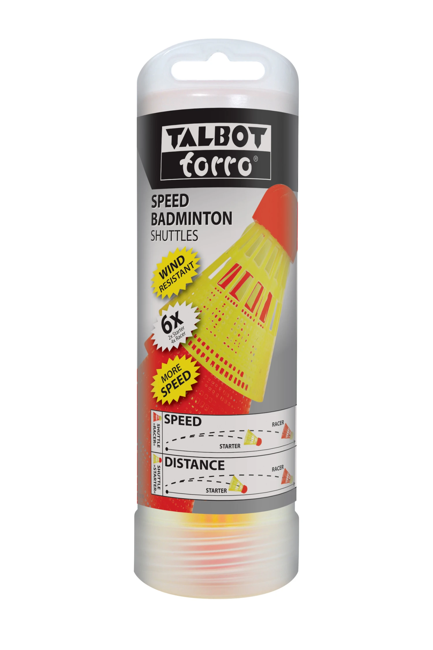 Die hochwertigen Talbot-Torro Shuttles in der 6er Dose sind perfekt für Speed Badminton Einsteiger und Fortgeschrittene. Die praktische Drehdose beinhaltet 4 schnelle „Racer-“ und 2 langsamere „Starter-“ Bälle. Speed Badminton ist das wohl vielseitigste Rückschlagspiel der Welt! Gespielt wird am Strand, im Park oder Garten – ganz ohne Netz. Der windstabile Ball ist schwerer und kleiner als ein normaler Federball und bringt dabei ein Extra an Speed.